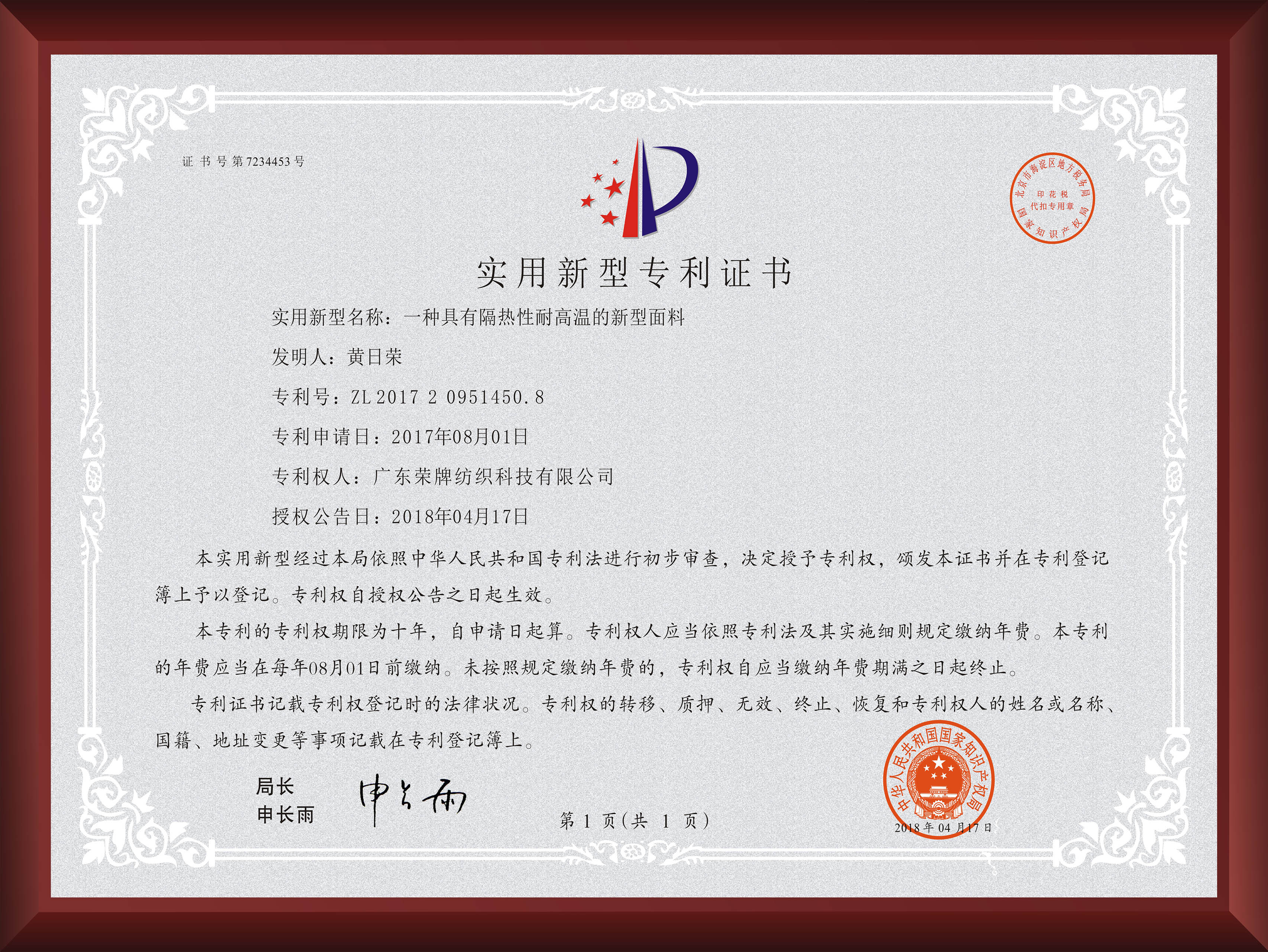 具有隔热性耐高温的新型面料 - 实用新型专利证书