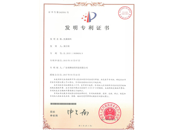 防辐射高色牢度的功能性面料 - 实用新型专利证书